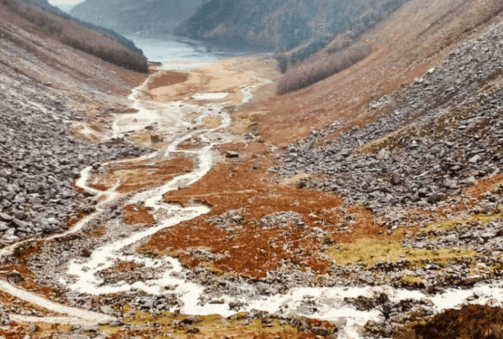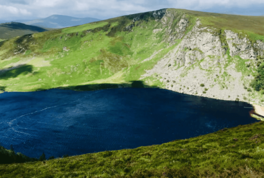 Scenic Glendalough hike trail in Wicklow Mountains.