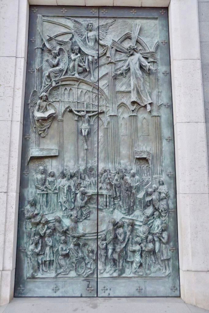 Catedral de Sta Maria la Real de la Almudena, the famous catherdal in Madrid. Most spectacular part of this structure – bronze relief door with images of some most famous people.