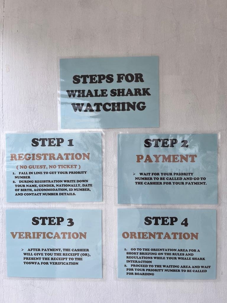 Registration process for swimming with whale sharks in Oslob: REGISTRATION – PAYMENT – VERIFICATION – ORIENTATION (briefing on rules and regulations on interacting with whale sharks).