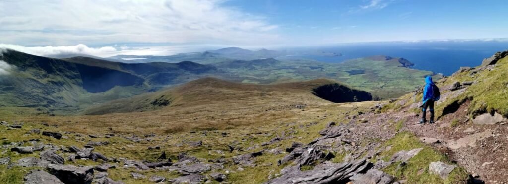 What is important on any mountain – be prepared for bad weather conditions, even if the forecast is decent. An easy hike can quickly become a nightmare if you are not equipped. I always say high quality hiking shoes is a must, your feet are working twice hard to get you to the top so treat them gently 😉 Have a rain jacket (water and wind proof) with you and always be prepared for strong winds, especially on oceanic west coast of Ireland. On a bright day the spectacular views spreading across the Blasket Islands and the whole ocean coast of the peninsula.
